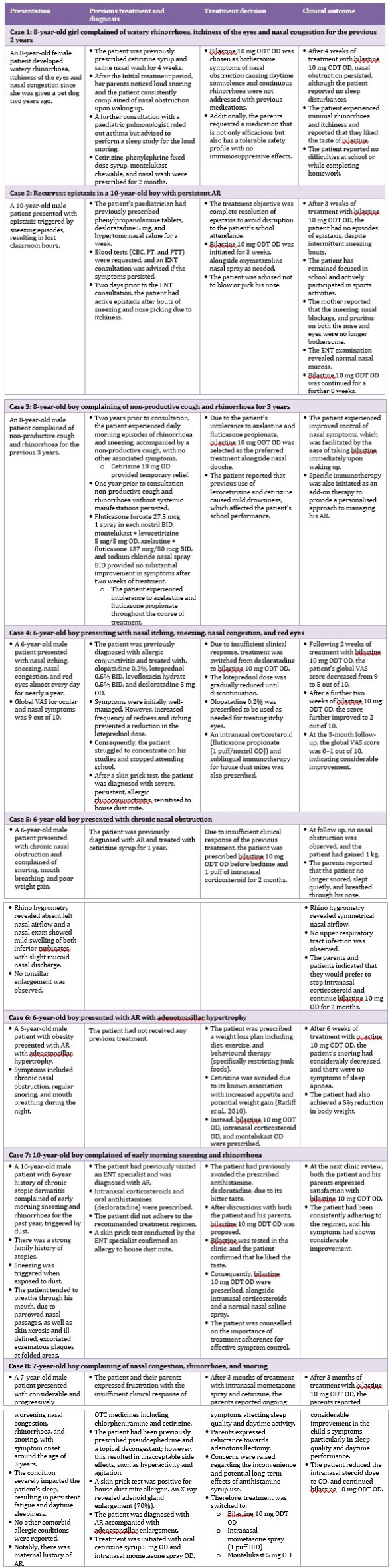 The primary reason for switching to bilastine 10 mg ODT once daily was an insufficient clinical response to their previous treatment (generally a second-generation antihistamine, in some cases with supportive nasal decongestants or saline sprays, or topical treatments) in seven cases, five AR cases (Case 1, 2, 4, 5, and 8) (Table 1) and two CU cases (Case 10 and 11) (Table 2). In Case 1 (AR), the patient suffered from continued nasal obstruction, which caused daytime somnolence, as well as rhinorrhoea, despite being treated with cetirizine syrup. Four weeks after initiating bilastine 10 mg ODT once daily, the patient reported no sleep disturbances, minimal rhinorrhoea, and no daytime somnolence during school hours or while doing homework. The paediatric patient in Case 2 (AR) was treated with desloratadine, but faced frequent epistaxis, which caused disruption of school attendance. Switching to bilastine 10 mg ODT once daily reduced symptoms so as to be no longer bothersome, allowing the patient to remain focused and active in school. Another child (Case 4, AR) experienced worsening conjunctivitis, despite treatment with desloratadine, which resulted in him not attending school. After initiation of bilastine 10 mg ODT once daily, their symptoms gradually decreased, from a VAS score of 9/10 to 0–1/10 after three months. In Case 5 (AR), the paediatric patient suffered from chronic nasal obstruction, snoring, and poor weight gain while under treatment with cetirizine syrup. Two months after switching to bilastine 10 mg ODT once daily, there was no observable nasal obstruction, and the patient slept quietly. Similarly, despite cetirizine treatment, nasal congestion, rhinorrhoea, and snoring, affecting both sleep and daily activities, continued for Case 8 (AR). Bilastine 10 mg ODT once daily led to marked relief from bothersome symptoms, improved sleep quality and daytime performance, and allowed dose reduction of supporting medications (intranasal steroids). While cetirizine provided some relief of intensely itching lesions for Case 10 (CU), there was no complete clearance, which was also not achieved after switch to desloratadine with supporting treatments (calamine lotion and topical corticosteroids). A switch to bilastine 10 mg ODT once daily was therefore initiated. After two months, the patient reported only minimal hives remaining, and considerable improvements in sleep and itch, with symptoms not being bothersome anymore, allowing full participation in school. The hives and itchy lesions of Case 11 (CU) initially resolved with chlorpheniramine (a first-generation antihistamine) but returned after treatment was stopped. The patient was started on bilastine 10 mg ODT once daily, which resulted in sustained improvements at three months.