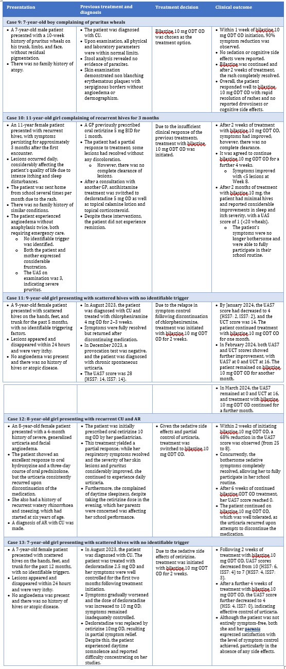 Table 2: Cases of CU treated with bilastine 10 mg ODT OD.