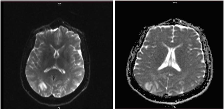 Figure 2: MRI image showing cortical/subcortical lesions in the occipital lobes.