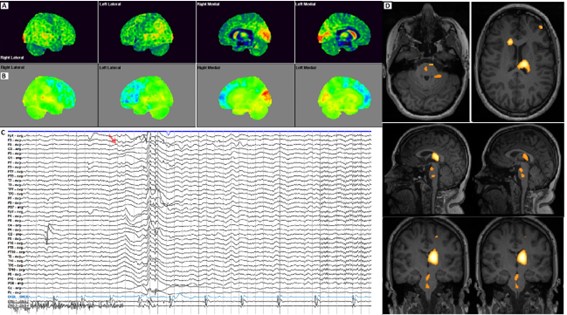 (Fig. 1) 18F-FDG PET/CT (A, PET cortical surface normalized; B, PET cortical Surface parametrical maps) both bilateral left predominant decreased radiotracer uptake in medial and lateral association frontal cortex. EEG (C, representative EEG epoch illustrating the onset of a typical atonic seizure in this patient. The record is displayed over 10 seconds/page in a referential montage with a common-average reference (International 10–20 system), and supplementary frontotemporal electrodes. High-and low-frequency filter settings were 30 Hz and 1 Hz, respectively. EMG leads (bottom two channels) were placed over both deltoids to capture muscle activity. The red arrow indicates the moment of seizure onset, characterized by a generalized electro decrement accompanied by a high-voltage delta slow wave over the right hemisphere, followed by generalized delta activity most prominent in the frontotemporal regions. Superimposed on this slow activity, a low-voltage, fast (beta) rhythm emerges toward the end of the page. Notably, from the onset of the seizure, EMG activity markedly diminishes, consistent with the sudden loss of muscle tone characteristic of an atonic seizure. Ictal SPECT injection was performed in this atonic seizure, 4 seconds after the onset in a seizure of 15 seconds. SISCOM images using Neurocloud® Software using AAL Atlas age-matched normal controls (D, Z-scores superimposed on MRI) revealed a markedly high uptake in left thalamus (medial region), right head caudate nucleus, and mild to moderate in left middle frontal gyrus, left superior temporal gyrus (Table 1), and additionally in brainstem areas related to ascending reticular activating system (ARAS - interpeduncular nucleus, nucleus reticularis pontis caudalis with anterior and left extension).