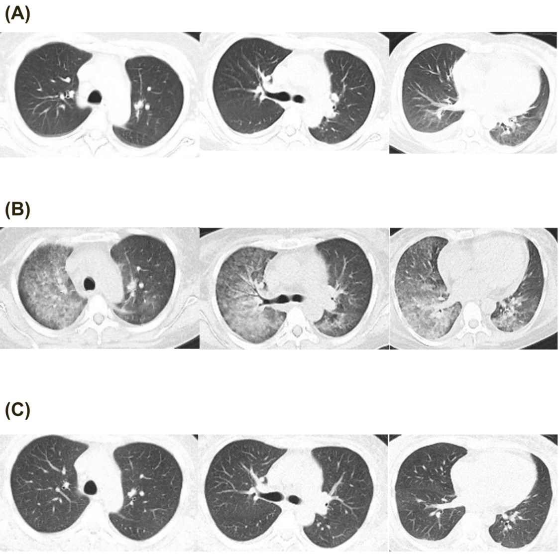 Figure 1: Chest CT images. (A). CT at admission. (B). diffused glass ground opacity on CT after one week of admission. (C). infiltration disappear on CT after two week’s admission.
