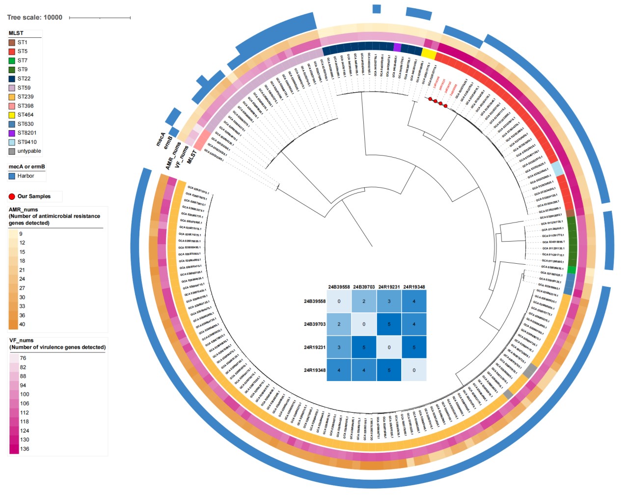 Figure 2: Phylogenetic tree of the 4 isolates with 168 NCBI isolates. Sequence type (MLST), number of antimicrobial resistance genes (AMR_nums) and virulence factors (VF_nums), the presence/absence of mecA and ermB are annotated in the outer rings. The matrix in the center shows the paired core genome SNP differences between the four isolates from the patients, with 24B38558, 24B39703 from blood culture and 24R19231, 24R19348 from respiratory specimens. The 4 isolates are marked with red circles at the tips of the tree.
