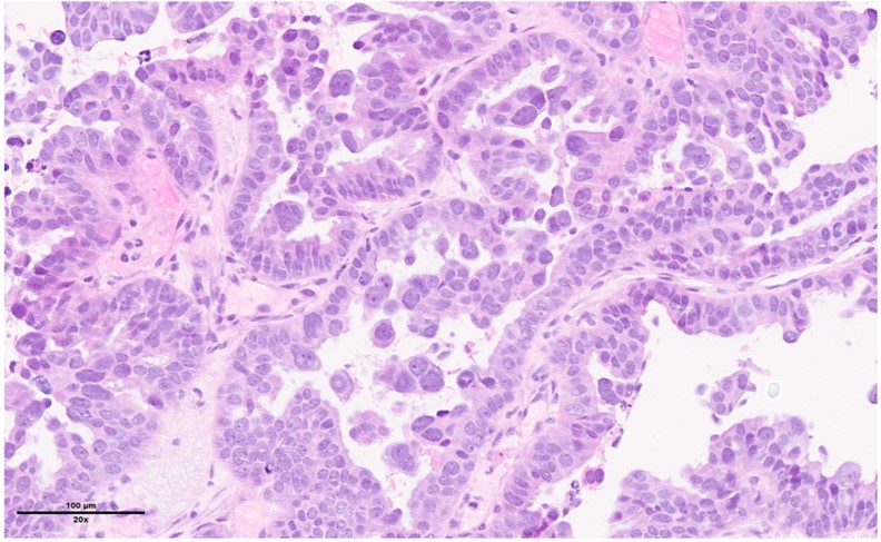 Figure 2: Pathology. HGSC with papillary achitecture composed of very atypical epithelial cells with pleomorphic nuclei, nucleolus, moderately abundant eosinophilic cytoplasm, and numerous mitosis (H&E. ×200).