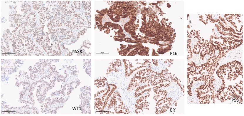 Figure 3: Diffuse positivity for PAX8, WT1, P16, ER and mutational p53 immunostaining pattern (×200).