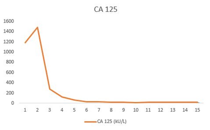 Since a complete debulking surgery was impossible due to the extent of the disease, the patient received systemic i.v. chemotherapy by carboplatine AUC 6 and paclitaxel 80mg/m2 for six cycles. Following an initial increase of CA 125 levels, CA 125 decreased and normalized (Fig. 4).