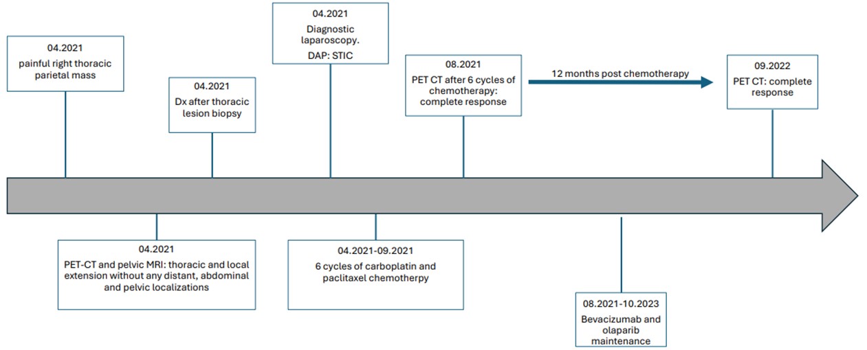 Based on the absence of specific treatment guidance to treat our patient and acknowledging the immunohistochemical profile and STIC detection we treated our patient according to HGSOC treatment algorithms. The no-debulkable thoracic disease mandated for a metastatic stage treatment plan including systemic platinum based-doublet chemotherapy, followed by bevacizumab and olaparib maintenance based on the PAOLA-1 treatment regimen (Ray-Coquard et aI., 2019). Two years after her diagnosis, the patient is in complete metabolic response and moved on towards the end her two-year olaparib maintenance.