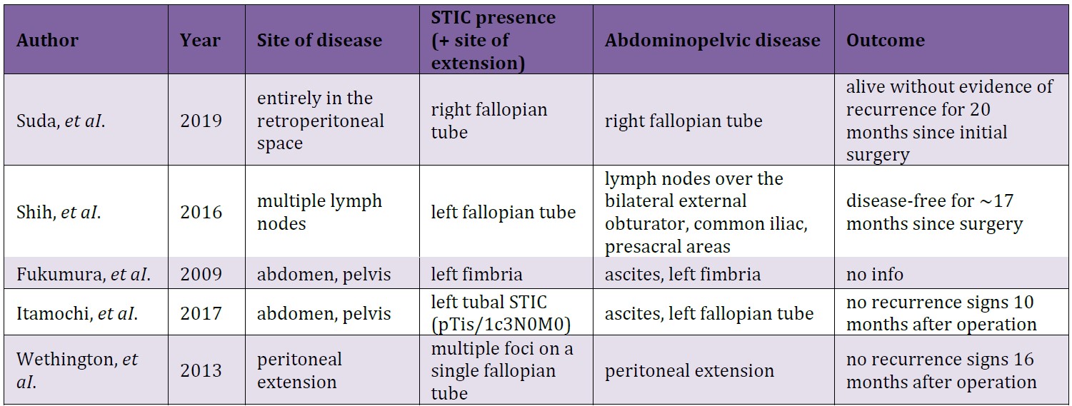 As already mentioned, we performed a comprehensive review of the literature, in order to establish the optimal treatment plan for this surprising clinical situation. We used the following research engines: PubMed, Google, and Google Scholar. The following research key words were used: “primary HGSC”, “extra abdominal sites”, “thoracic HGSC” The review did not yield any similar reports of HGSC exclusively evolving in the extra abdominal/extra peritoneal sites in the absence of primary invasive HGSC in the gynecological, abdominal and peritoneal organs. We thus extended our research to “STIC and extra abdominal sites”, “STIC and internal mammary chain lymph nodes”, “STIC and mediastinal lymph nodes” and “STIC with pleural direct metastasis”. The table (Table 1) resumes the results.